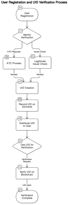 4. Recording UID on the IDCHAIN Blockchain: The created UID is recorded on the IDCHAIN blockchain. This recording guarantees the security, integrity, and immutability of the user's identity data.